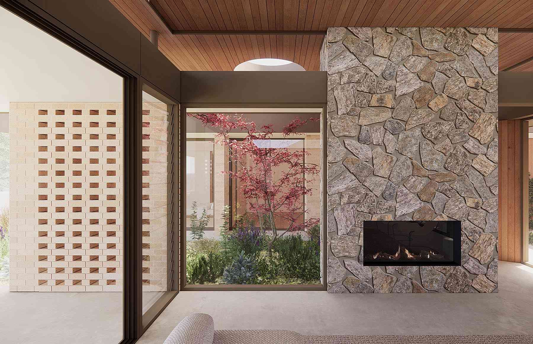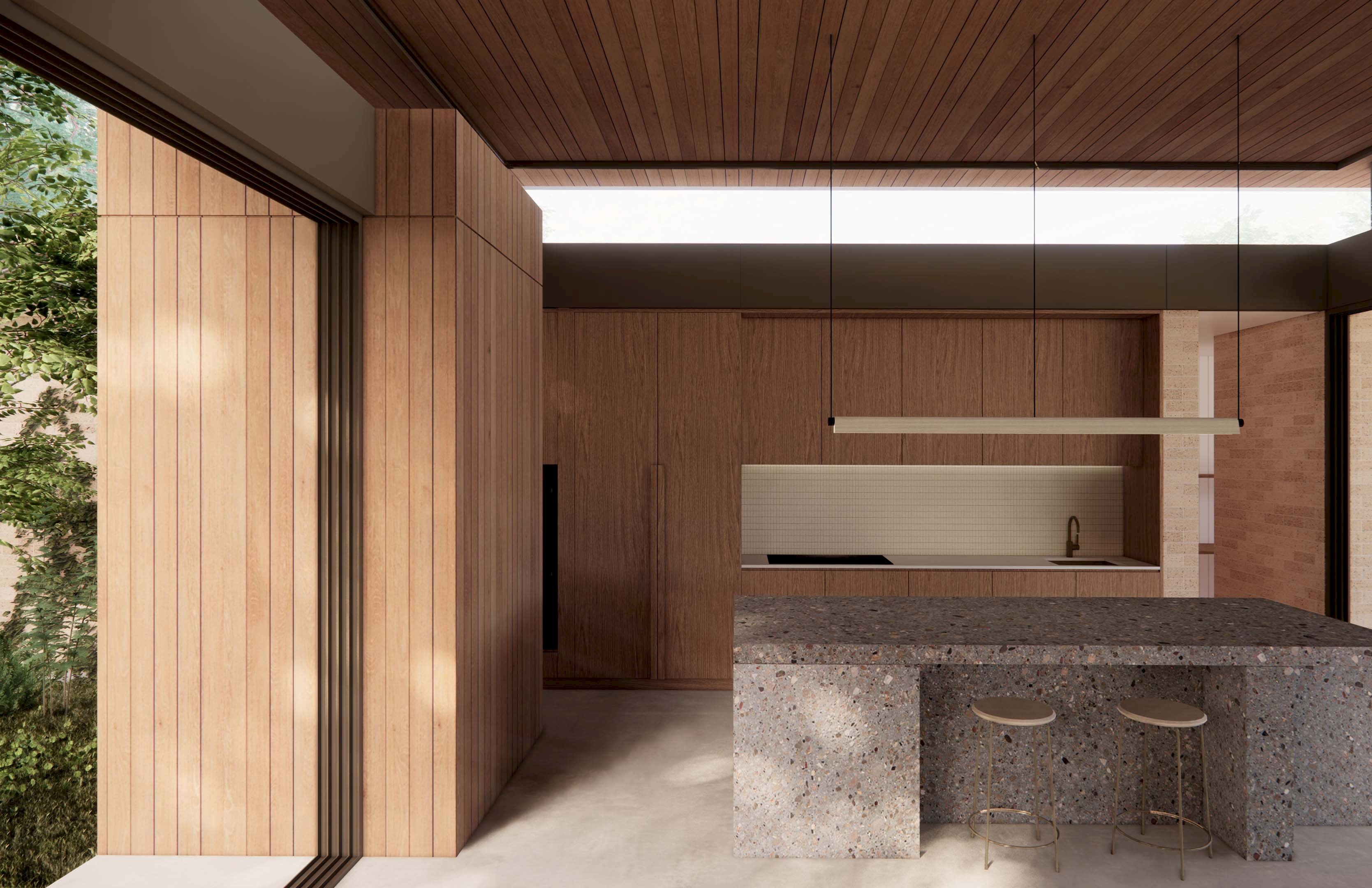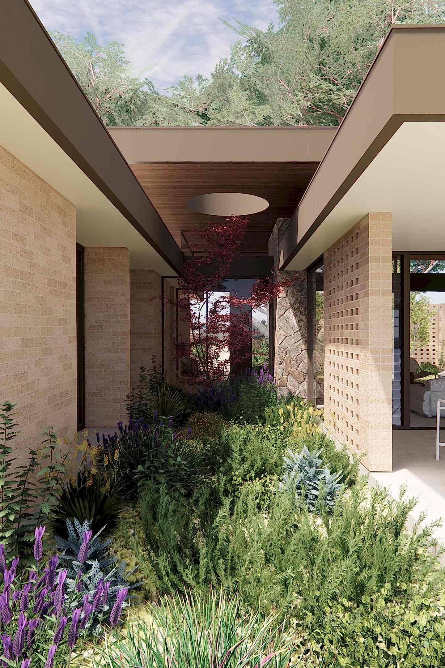 Strategic orientation and passive design principles promote year-round comfort. Deep overhangs shield the western glazing from harsh afternoon sun, while glazed louvres provide cross-ventilation. The result is a home that breathes with the seasons, where evening peppermint teas on the patio are savoured in tranquil bliss.