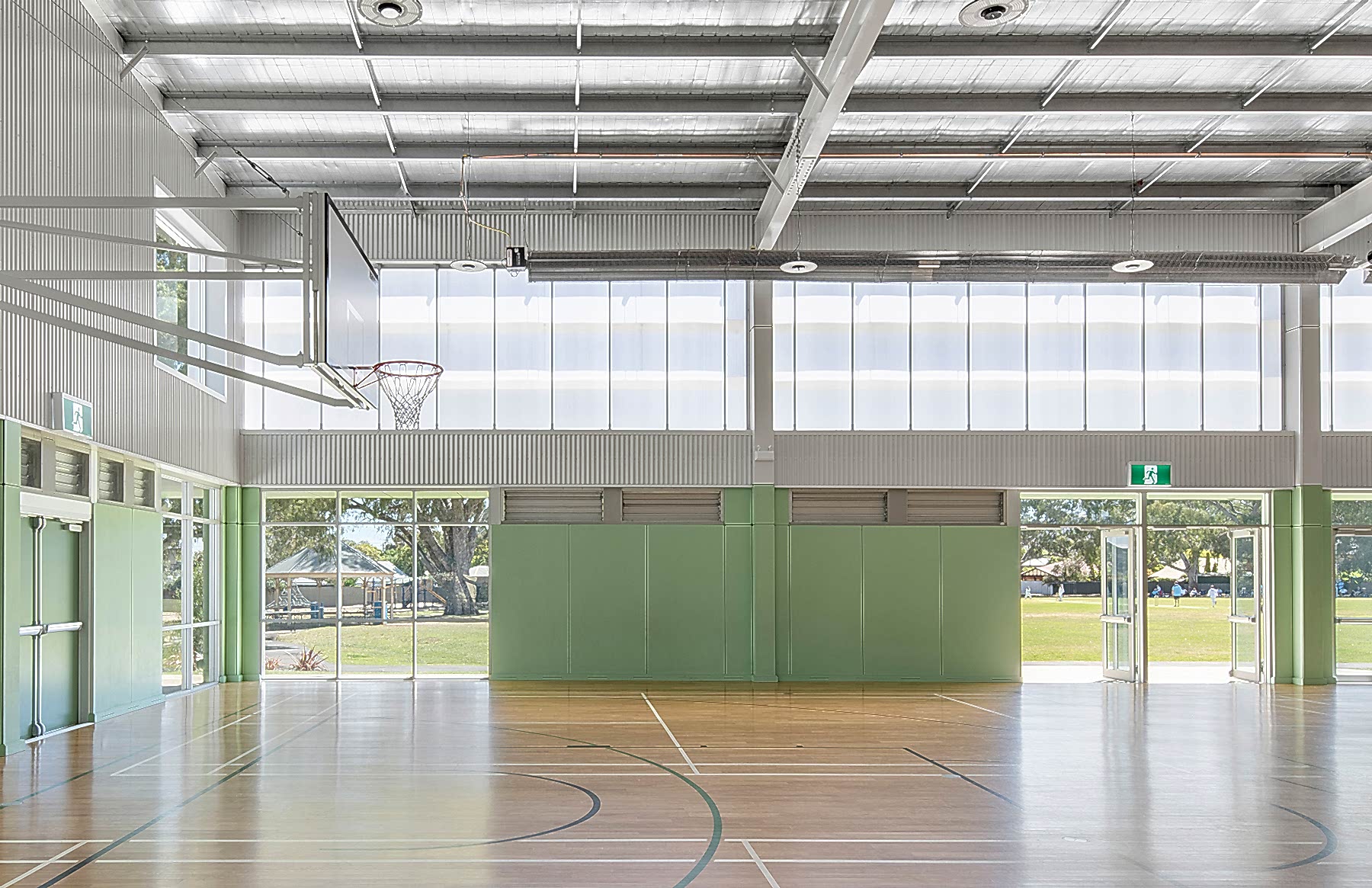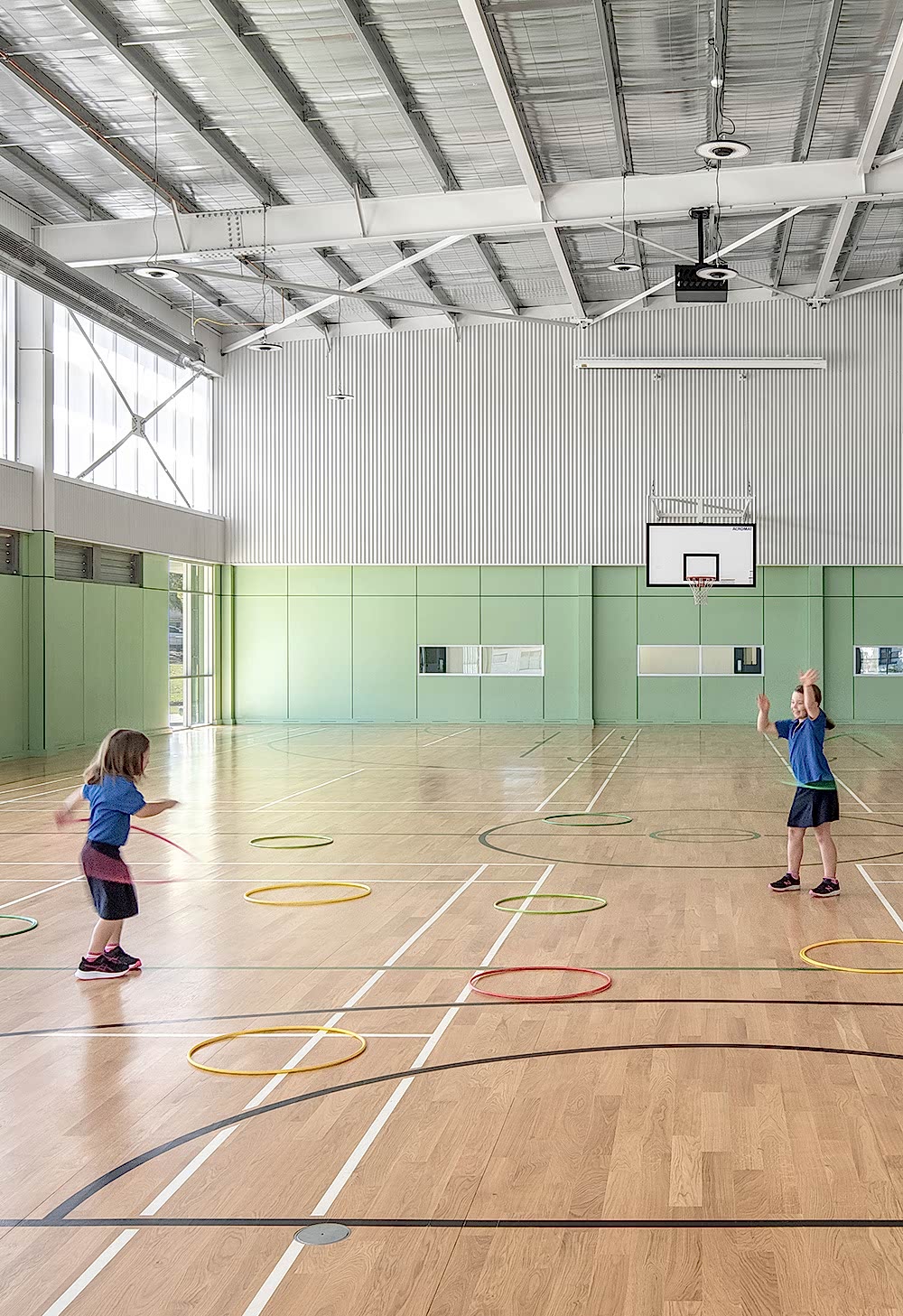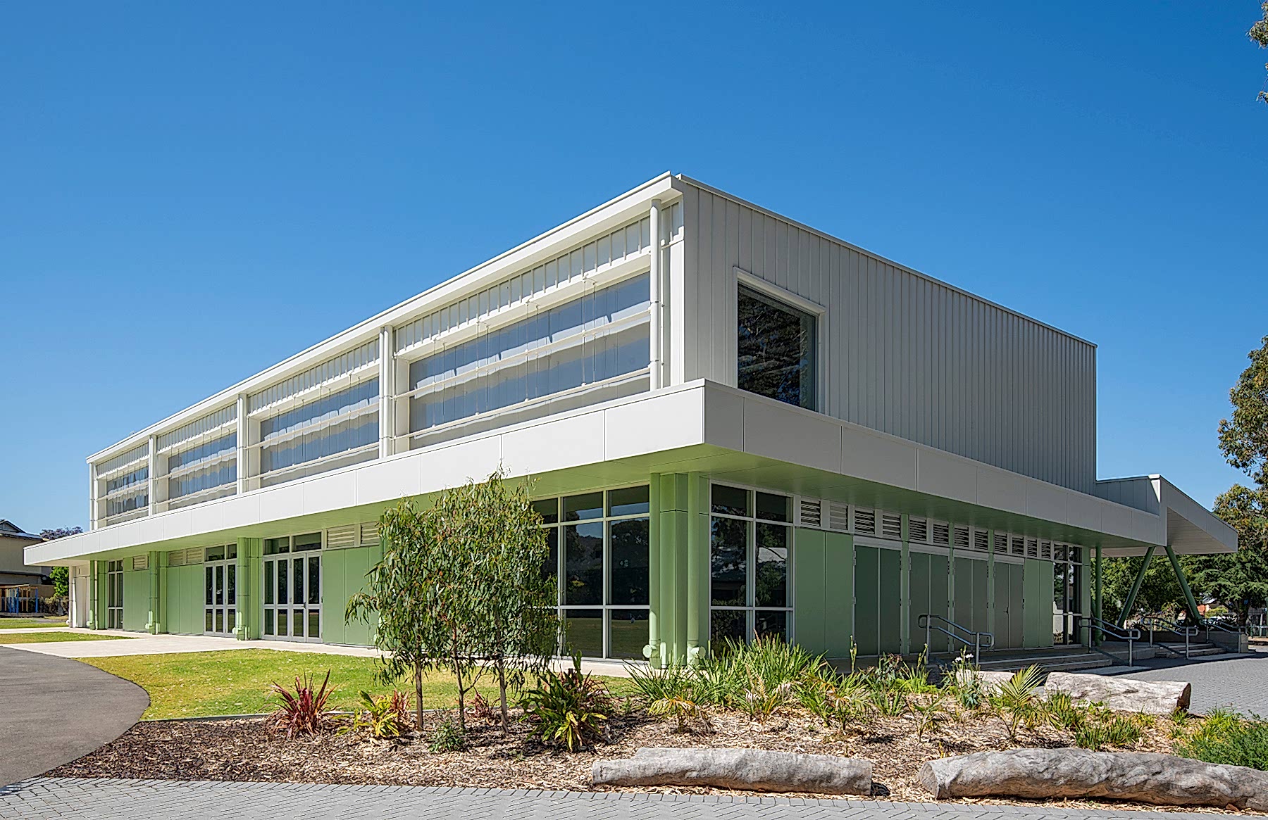 The solution, a 600m2 flexible activity zone with interconnected learning and support spaces, designed to cater to a multitude of school community needs. Supporting more than just the physical education and performing arts curriculums, every space is crafted with purpose and versatility in mind. Strategic transparency and thoughtful planning ensure seamless integration with the site, while a palette of subtle green and warm white cladding pay homage to the surrounding natural environment and add a touch of playful whimsy.