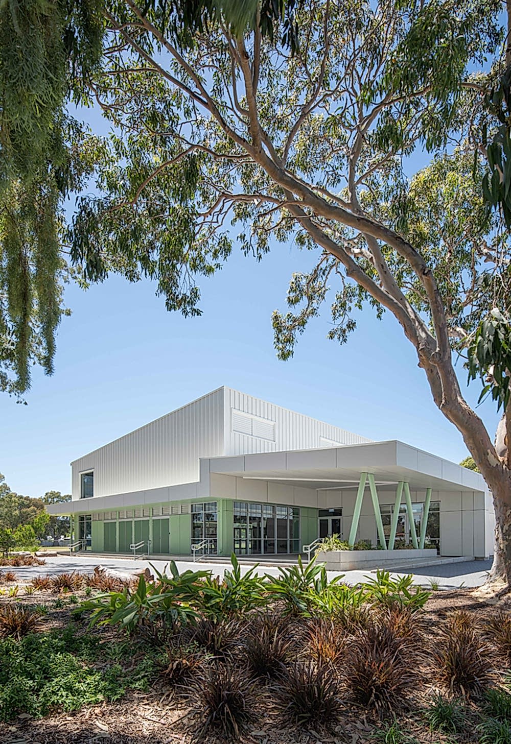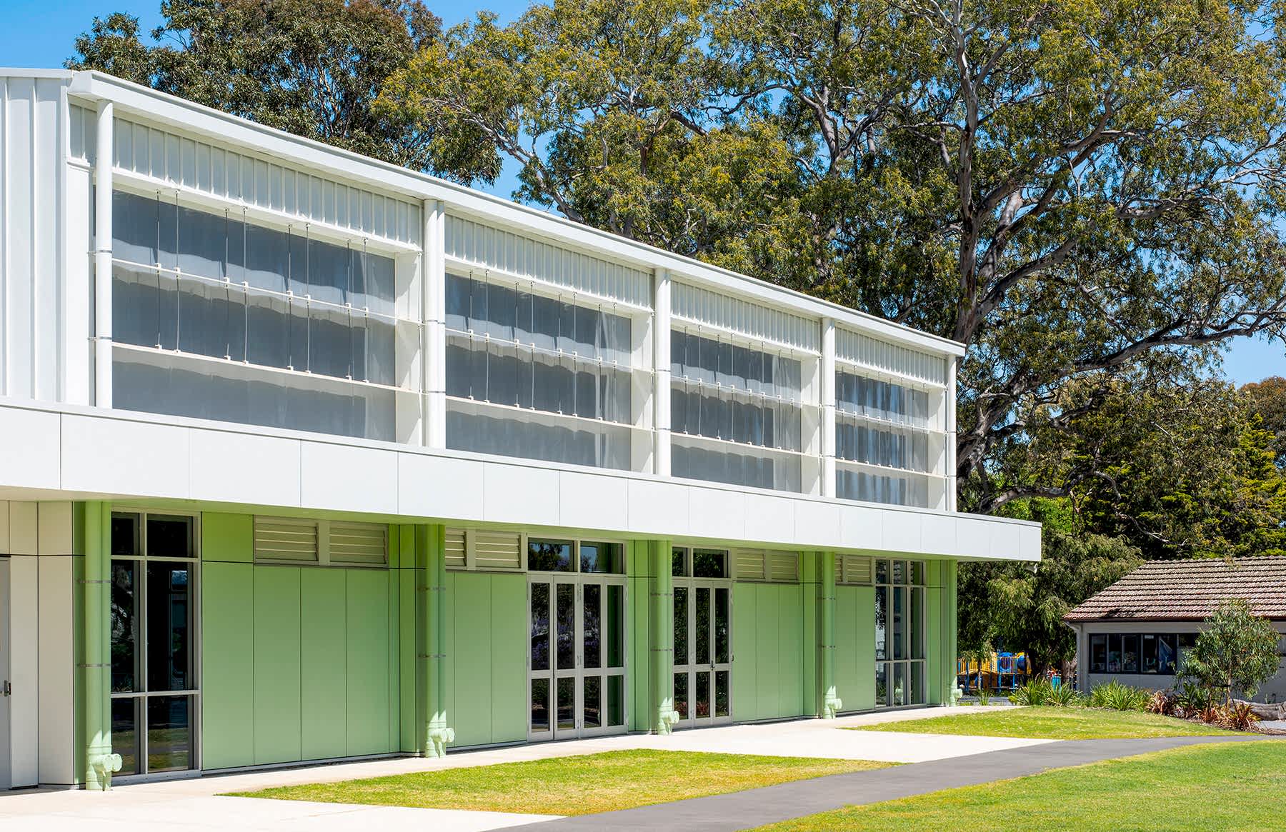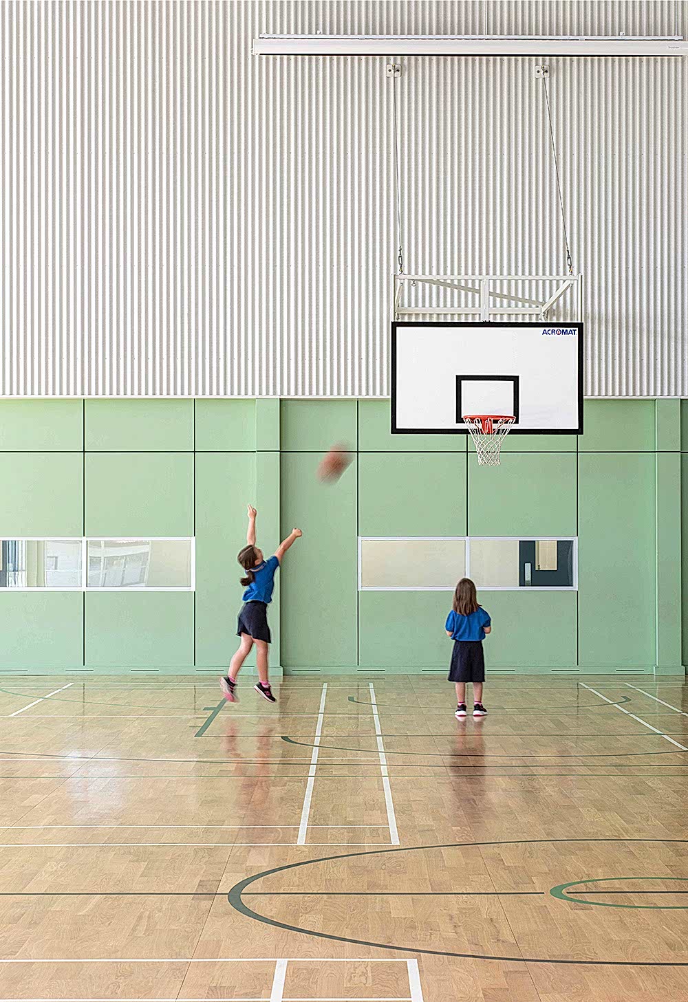 The solution, a 600m2 flexible activity zone with interconnected learning and support spaces, designed to cater to a multitude of school community needs. Supporting more than just the physical education and performing arts curriculums, every space is crafted with purpose and versatility in mind. Strategic transparency and thoughtful planning ensure seamless integration with the site, while a palette of subtle green and warm white cladding pay homage to the surrounding natural environment and add a touch of playful whimsy.